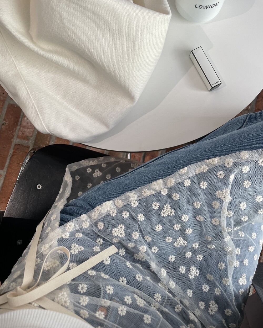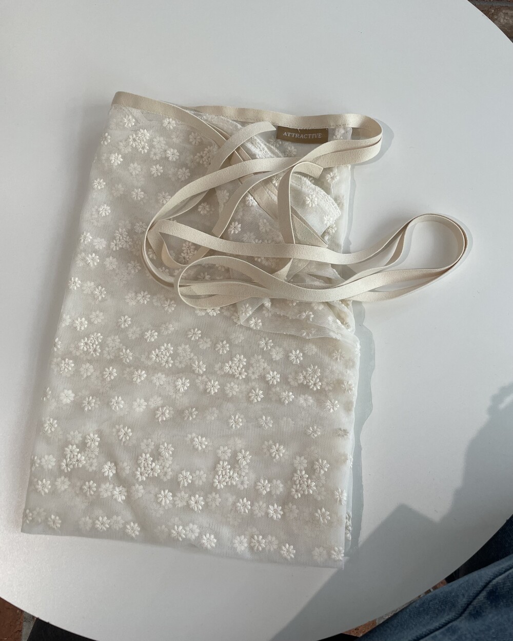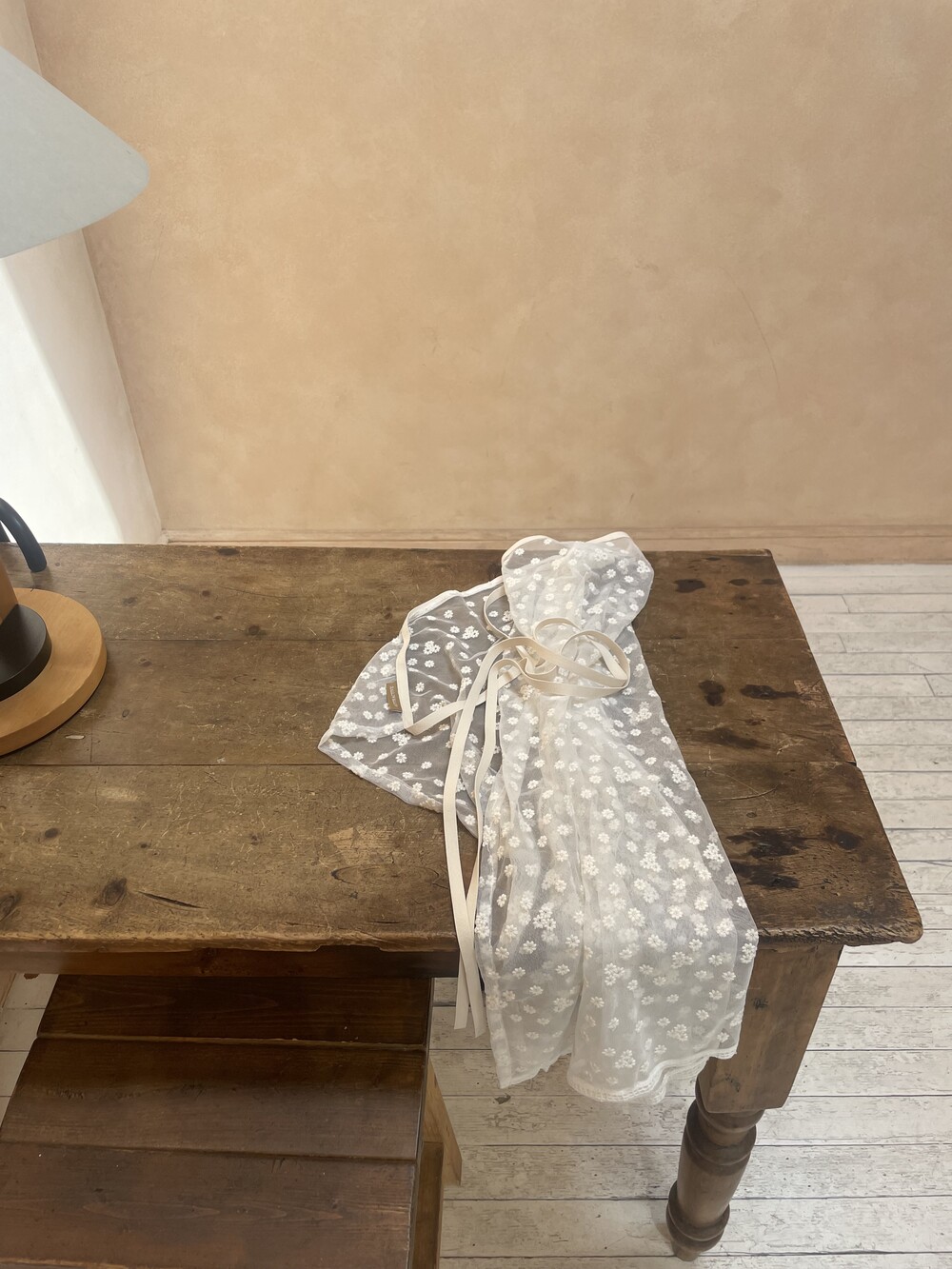 사랑스러운 플라워 자수가 놓여진 레이스 원단으로 제작한 랩스커트 에이프런