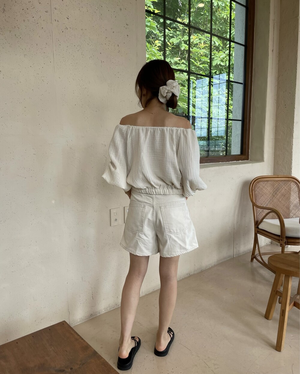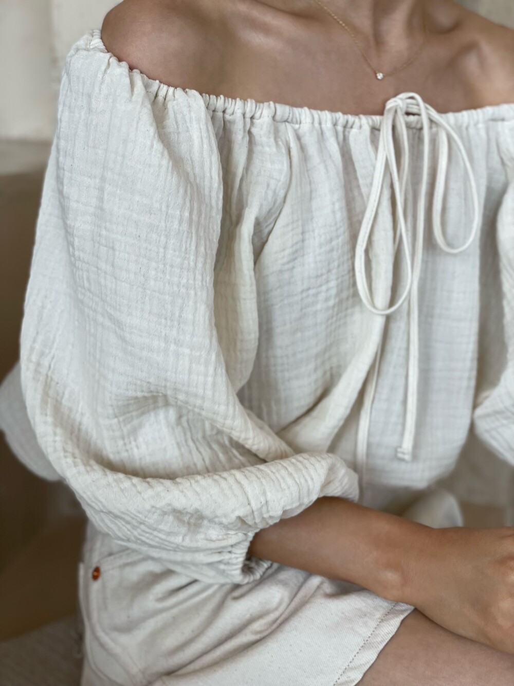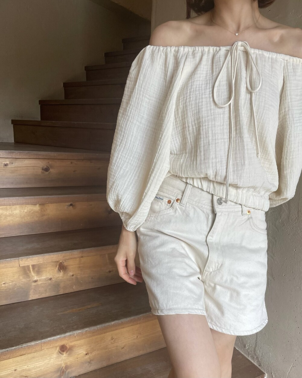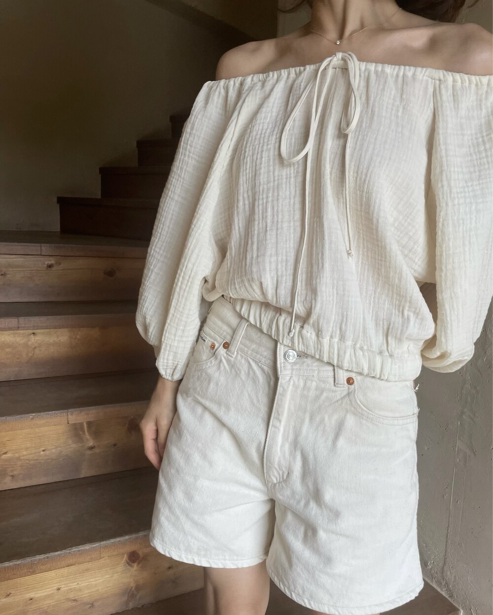 내츄럴 오프 숄더 블라우스