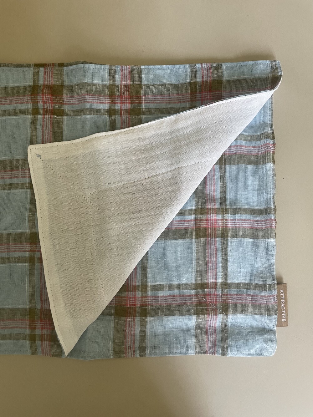 블루 체크 원단과 거즈 원단을 양면으로 제작한 테이블 매트