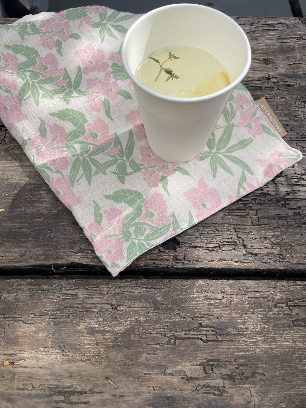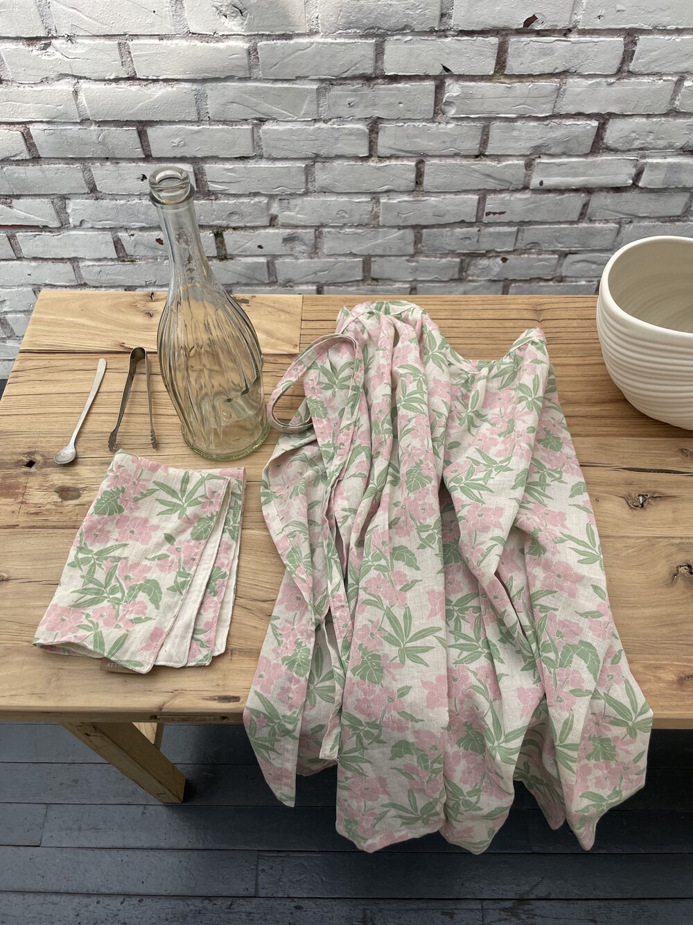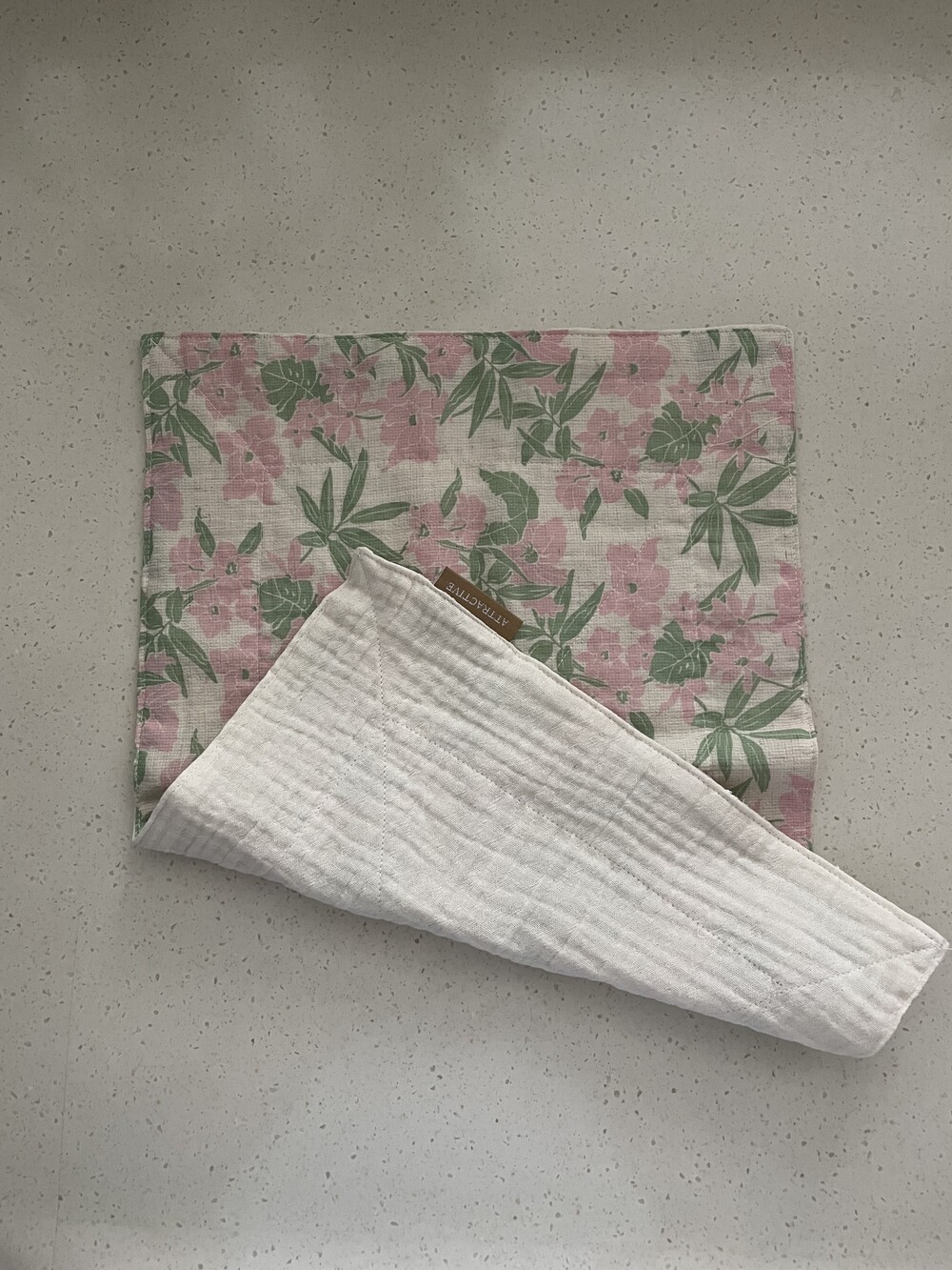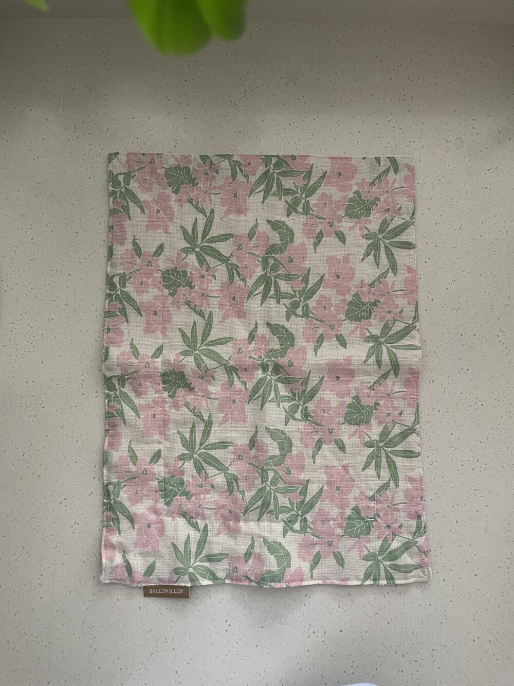핑크 플라워 리넨 혼방, 이중 거즈 원단을 양면으로 제작한 키친 크로스