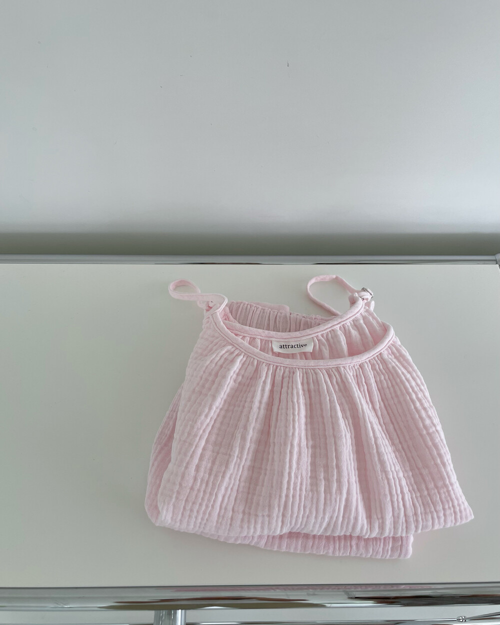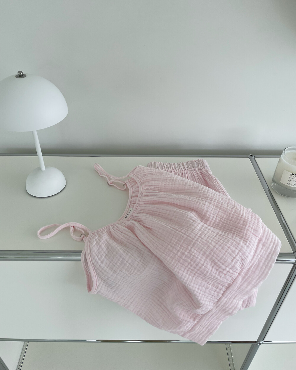 이중 거즈 소재를 사용하여 만든 셔링 슬리브리스